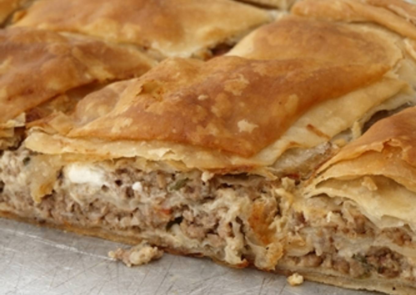 A flavorful moroccan pastilla: layers of phyllo dough, stuffed with meat & onion mixture then baked.