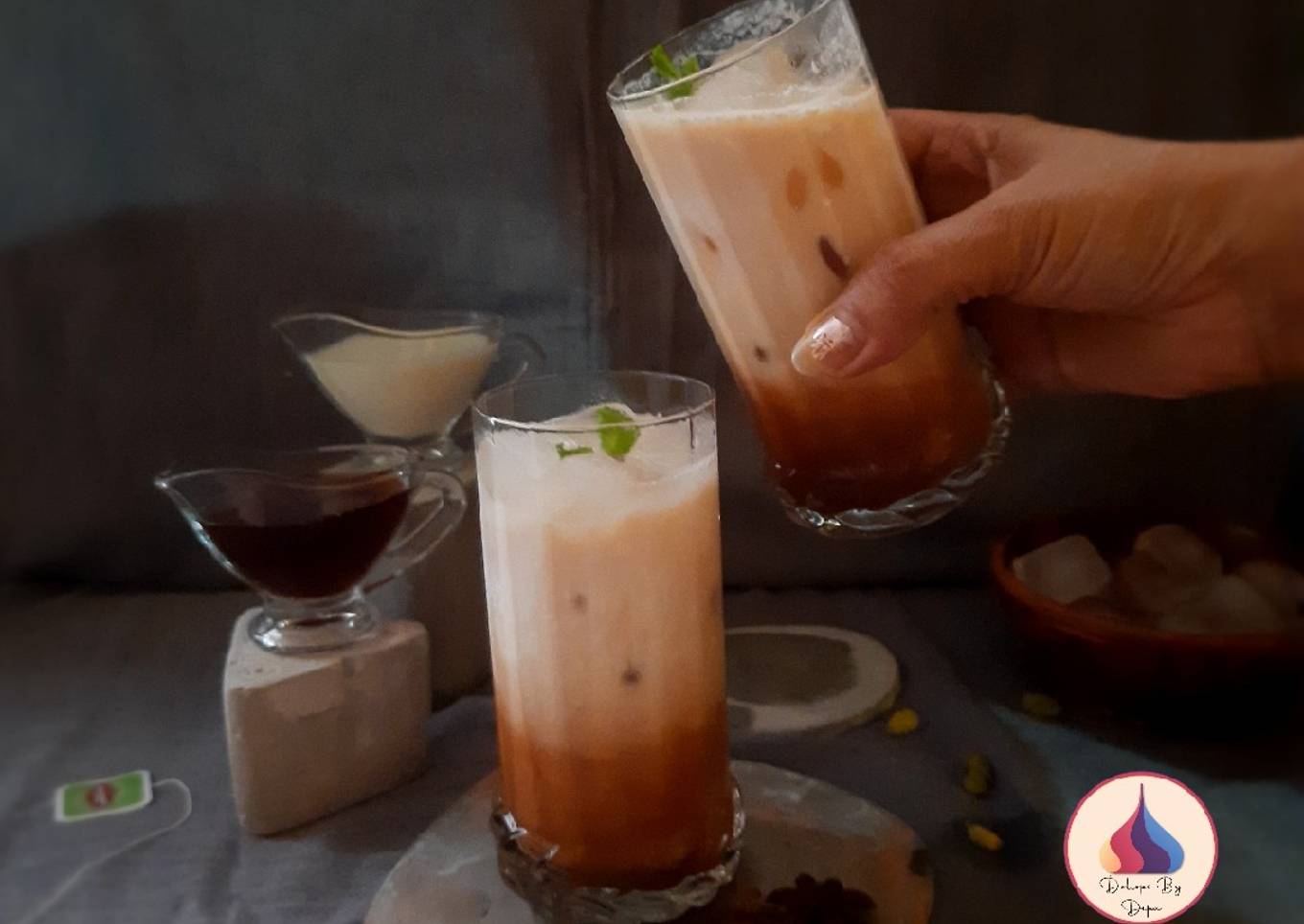 - At the time of serving, fill the glass with ice cubes. Add chilled tea, till 3/4 glass is filled.