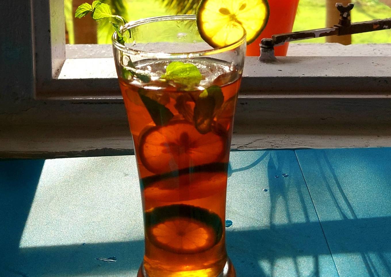 - Pour the cooled iced tea. Garnish with basil leaves. Serve chill.