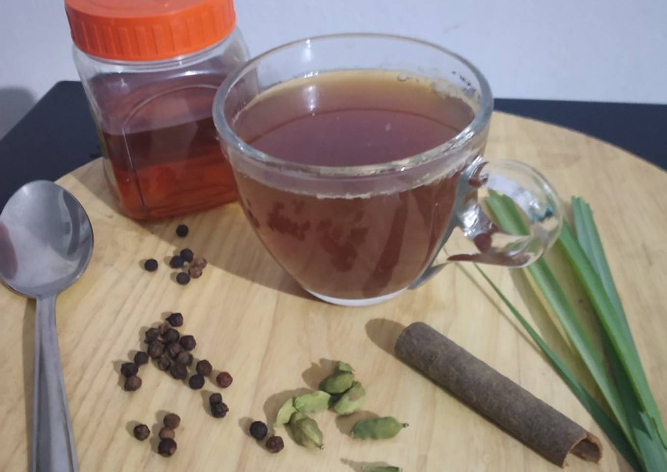 - Cut the lemongrass into pieces.Heat a pan pour 1 glass of water put lemongrass let it comes to a boil.Put 1"ginger grated,2 cadamom,1cinnamon stick& cover it for 1 mints.Put tealeaves (optional).Add blackpepper powder & boilsit for 1 mints.