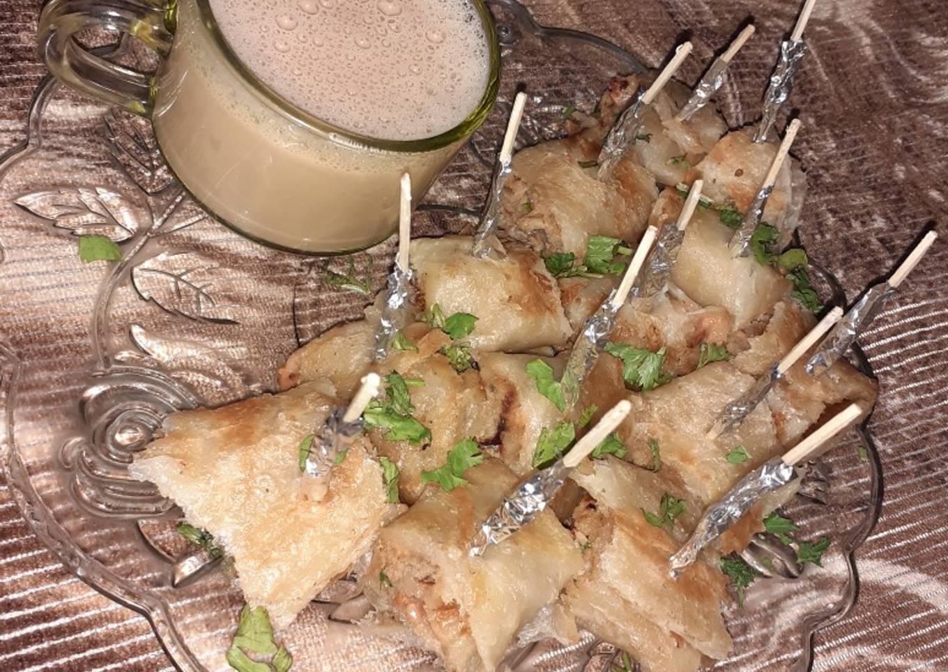 - Set kababz mixture in one side of paratha and roll it. Cut it in small bite size pieces and insert it a toothpick or any stick for binding.