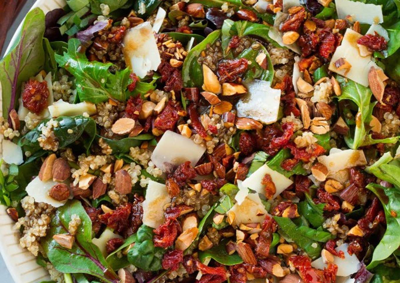 - In a salad bowl layer together spring lettuce blend, basil, quinoa, parmesan, almonds and sun dried tomatoes.